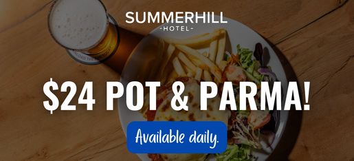 Enjoy a delicious Pot & Parma for just $24 every day at Summerhill Hotel.
