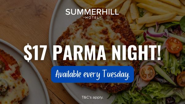 Enjoy our delicious classic chicken parma with chips and salad for just $17 every Tuesday night!